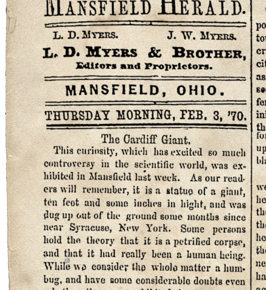 The huge “petrified man” came to be known as the Cardiff Giant, and he toured the country as a bona fide American wonder. In February 1870, he made an appearance in Mansfield that had the effect of stoking the flames of local archaeology. It is significant that the Ohio Archaeological Society originated in Richland County in 1875. Inquiring minds were eager to dig out the facts and fossils.