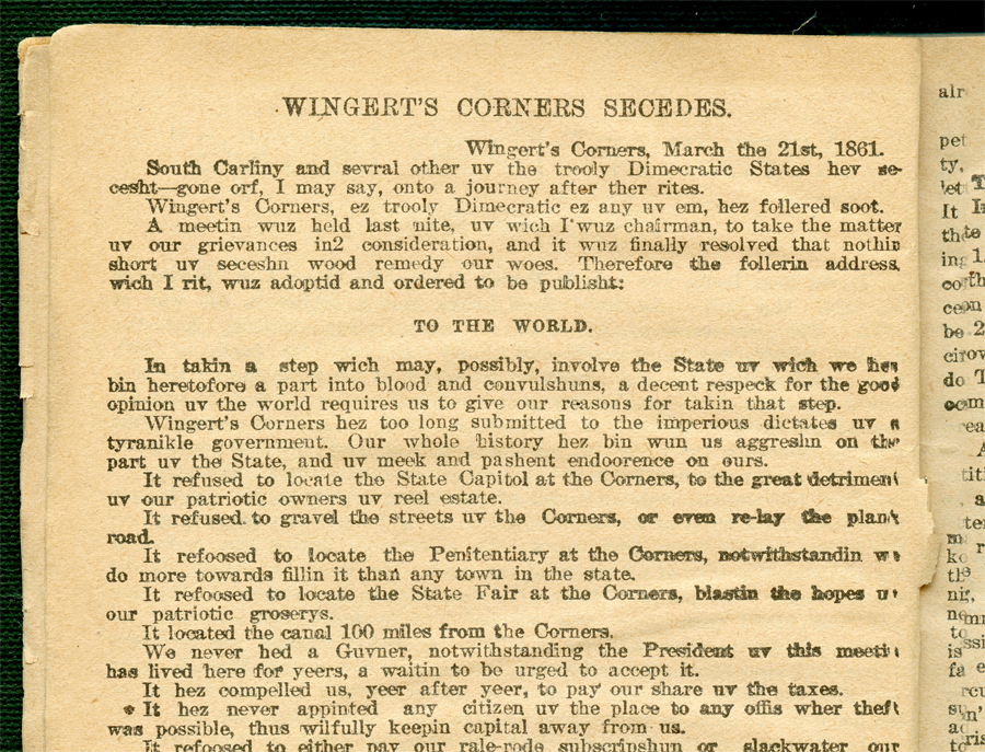 It was during his stay at the Bucyrus Journal when Locke’s humor became politically radicalized. On the eve of the Civil War, when nobody could speak of anything but the South threatening to split off the United States, the writer mocked all the indignant posturing by posting a proclamation in his paper declaring that Crawford County was seceding from the Union.