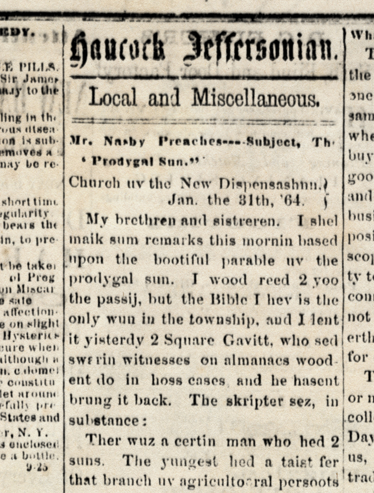 It is easier to read the Nasby papers by keeping in mind that Locke’s writing style was not merely propaganda, but an actual weapon of war. It’s not for the squeamish. Aside from the challenging spelling that a reader has to navigate, the content of anger and bitterness can be a mean and smelly swamp to get through.