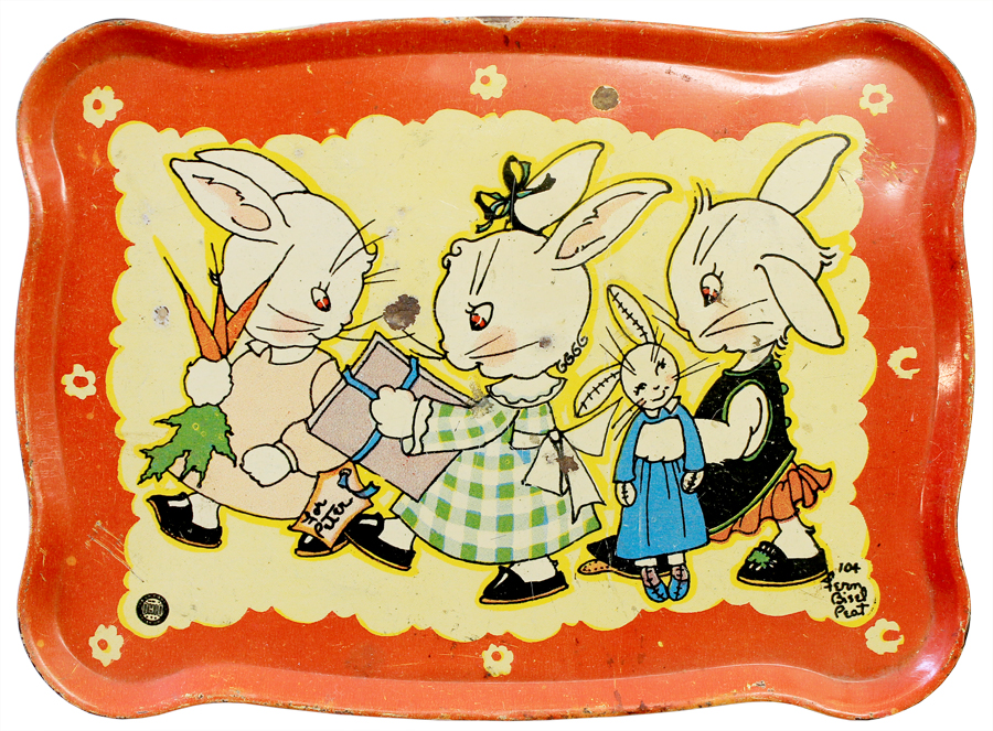 The Ohio Art Company of Bryan, Ohio, produced her designs on toys of all description including no fewer than 7 tea sets, 5 watering cans, 17 buckets and sand pails of all sizes, 3 drums, 9 tops, 4 miniature tea sets, banks, washing tubs & washboards, and snow shovels.