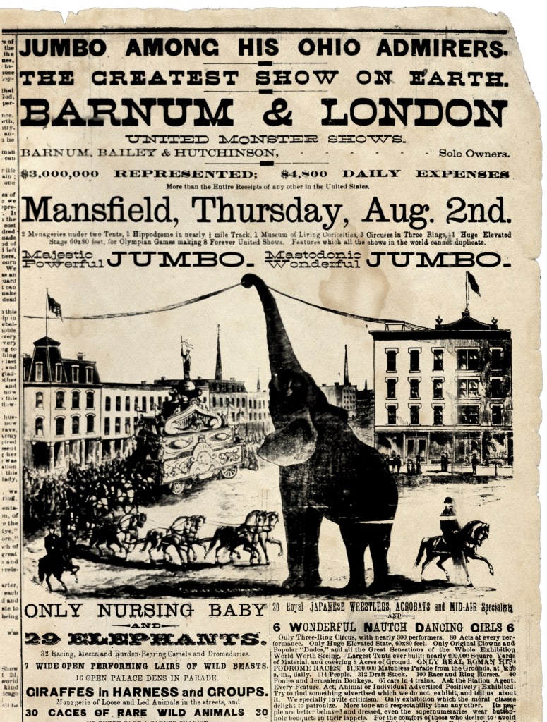 There have been many elephants on the streets of Mansfield after Jumbo, as dozens of snapshots can attest. There were elephants here as early as 1865, as newspaper ads can document. But there was never another elephant who claimed the hearts of folks like Jumbo.