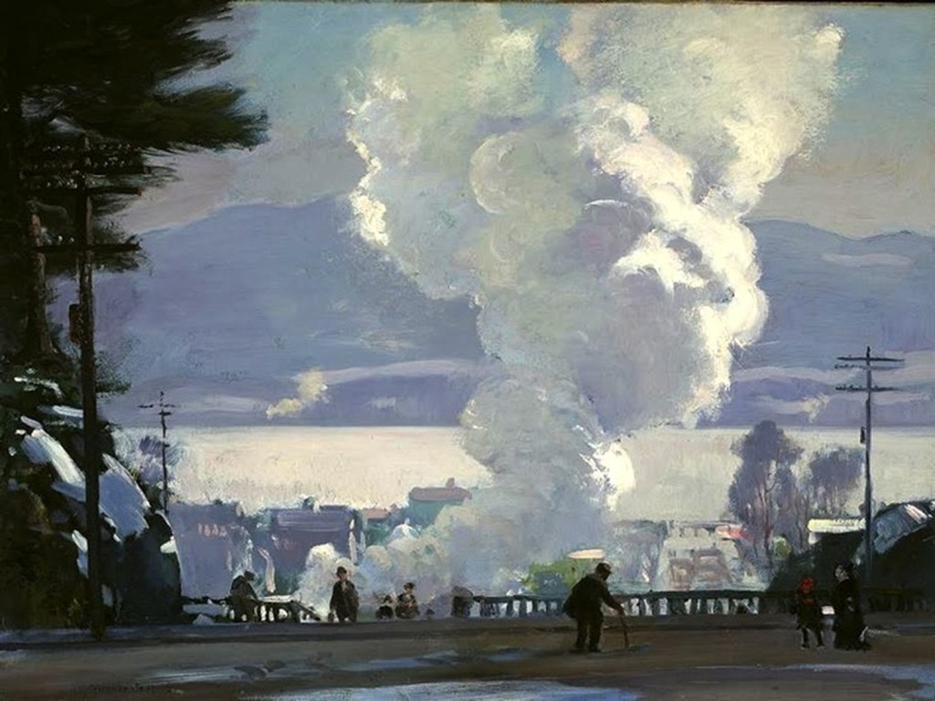 The work he produced certainly rewarded his effort in traveling to the site, because he was able to capture the luminous effects of the Crestline station in the evening sun as shadows move sideways, and the dark shine of dusk reflecting on the rails.