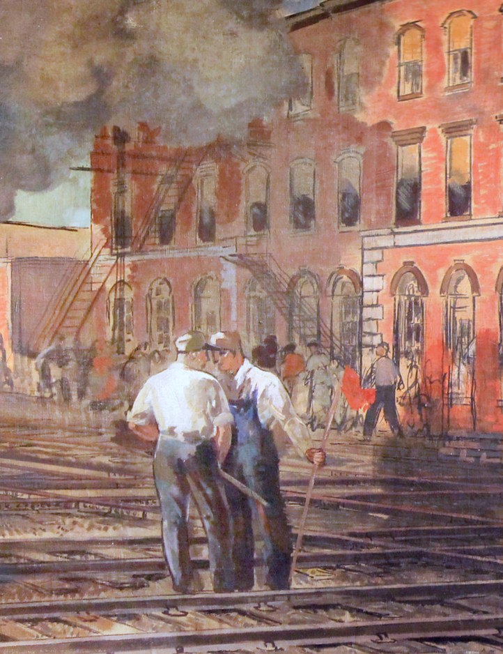 None of the buildings in the painting exist anymore, and of course trains don’t steam like that in the sun these days. Go to the place today where the artist sketched in the 1940s and you’re standing in the shade of a highway bridge in cindery dirt with wildflower weeds.