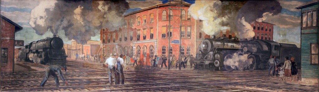 When he received the commission to paint Crestline’s mural Beal was living in New York City. He made his first compositional sketches from photographs, but when it came time to distill the essence of his scene it was easy enough for him to hop over to Grand Central Station and jump the New York Central or the Pennsylvania Railroad because they both went by different routes to the Continental Divide, and crossed at Crestline.