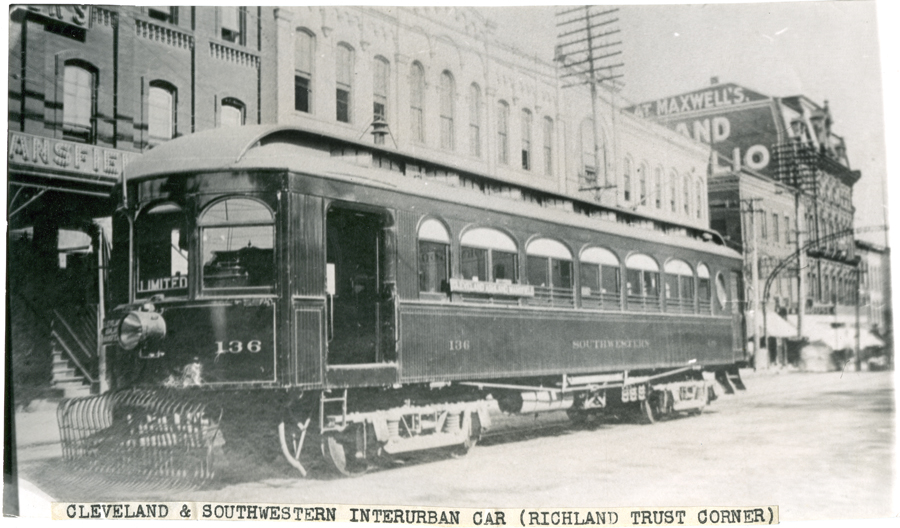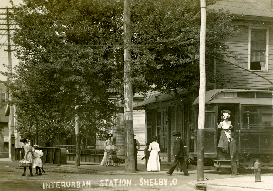 Interurban service to Shelby began in 1901. The route ran north on Bowman Street to the steel mill, and then paralleled the Pennsylvania Railroad tracks. There were 22 stops between Mansfield and Shelby, and a round trip cost 45¢.
