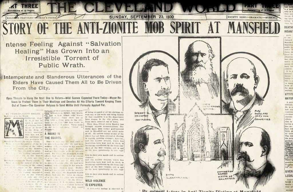 After the death of a child from a faith-healing gone wrong, there was bad blood in town, and the Elders of a curious new cult-like sect, known locally as Dowieites, were no longer welcome in Mansfield. Throughout the months of July to October the body politic of the city experienced an escalating sequence of feverous and sometimes ferocious convulsions in an attempt to throw off the ill will.