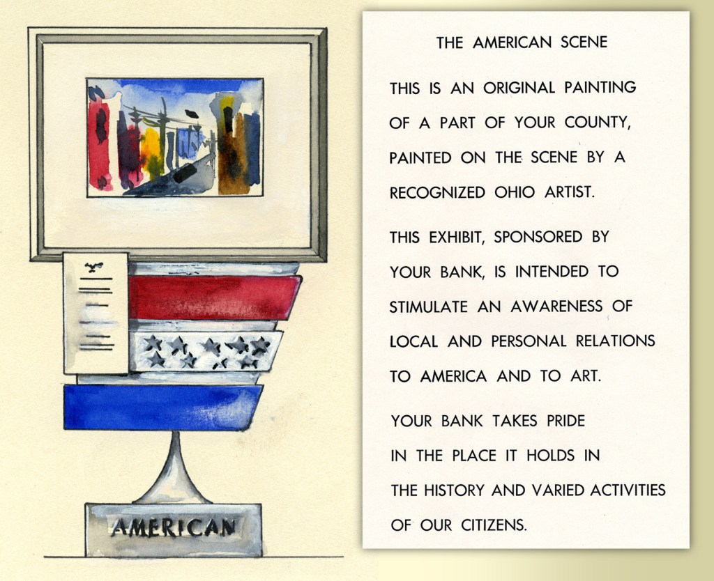 So he conceived a project that could bring this specific local art focus more daily into the life of the city. After studying which institutions in downtown Mansfield got the highest amount of foot traffic, he established an art showcase in the 1st National Bank, at the corner of Third and Main.