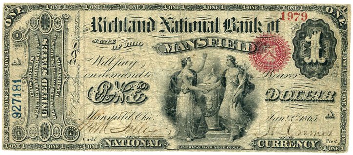 The Federal Government finally initiated the minting of greenbacks during the financial crisis of the Civil War, and that is when Mansfield got its first national bank—called, interestingly enough, the First National Bank of Mansfield.