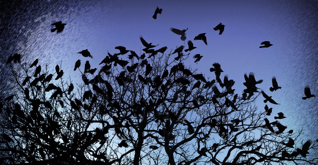 From all directions come the lines of winging birds, like threads tangling together into a snarling knot. You know you’ve found the epicenter of tonight’s congress of crows by the mass of wild activity— a cyclone of black wings blowing through their chosen canopy of oaks and buckeyes with a frenzied racket.