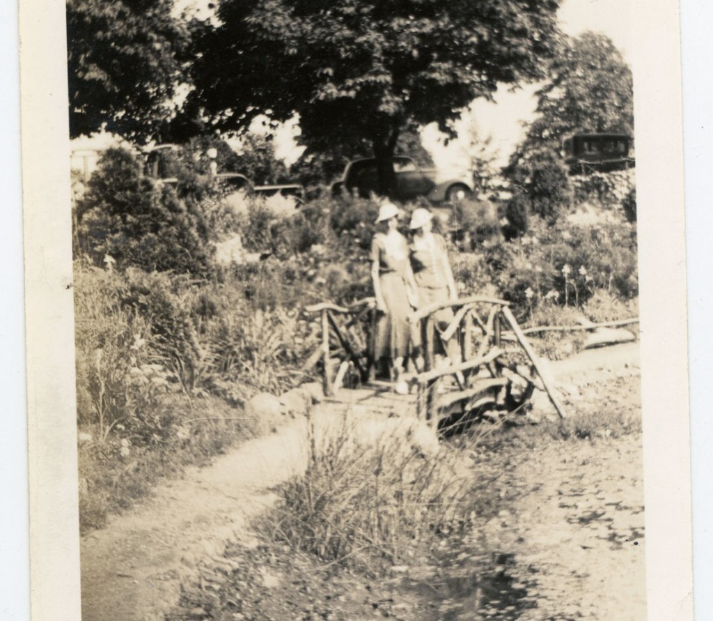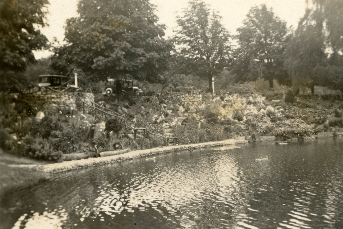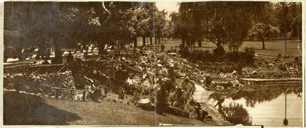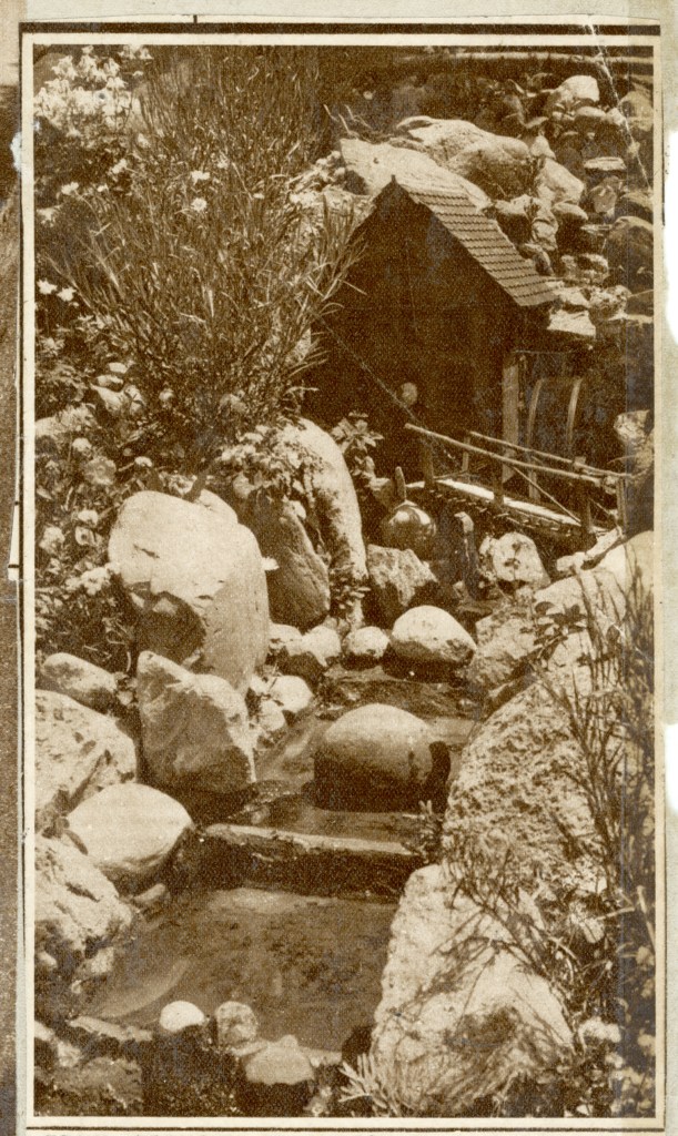 The story—carried by Associated Press and printed as far away as San Bernardino CA—said the rock garden had “winding stone walks about the slope, observatories finished with rustic rails, a round bed in the water, and a cleverly designed cascade. At the cascade is a miniature mill with a realistic water wheel run from the water at a drinking fountain above.”