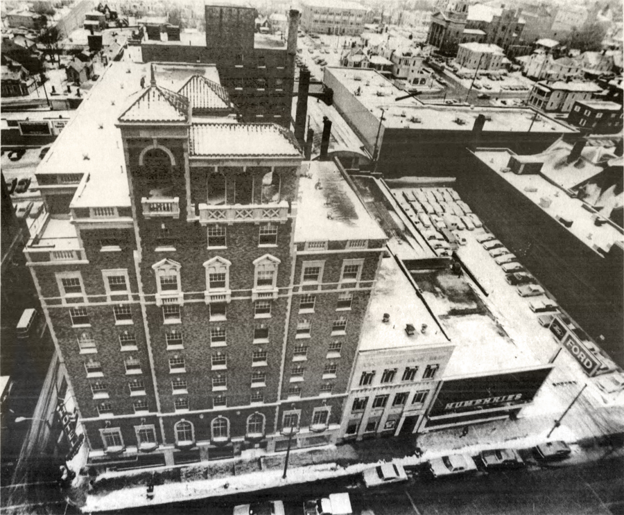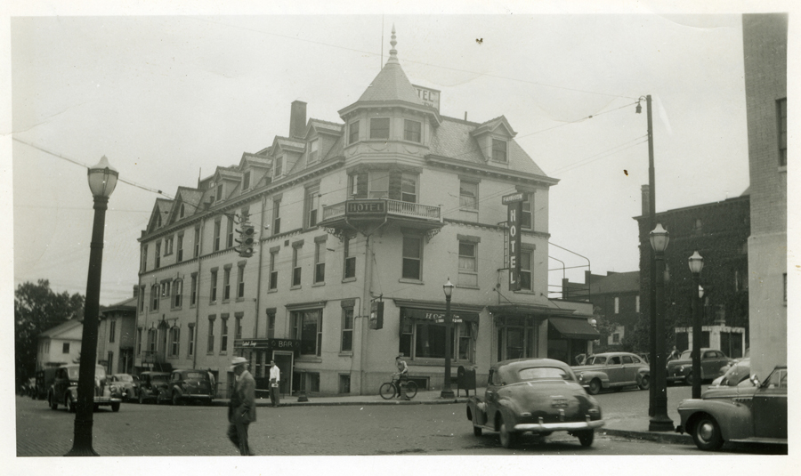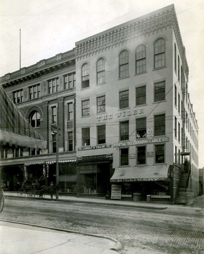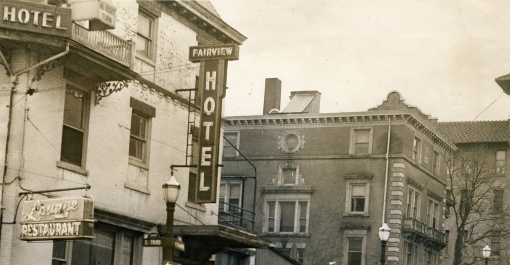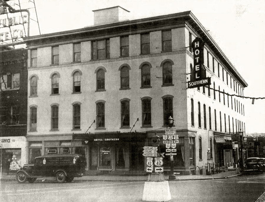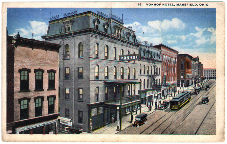 When Mansfield was a young village in the early 1800s, all of the business and legal activity of town was centered on the Square, so that’s where all the hotels were located. Among the first was the Franklin Hotel, seen in this 1840 image on the far left. It was gone long before the 1872 courthouse was built on that corner.The SW corner of the Square had the longest continual hotel accommodations beginning in 1814 when the North American Hotel was built. In 1829 the structure was fortified and enlarged as a brick building, and it was unquestionably Mansfield’s premiere lodging with huge stables in the rear facing Second Street. It served as the town travel station as well, meeting 8 to 10 stagecoaches a day.The North American’s business began to stutter at the end of the 19th century when challenged by many rival downtown hotels, and took a new name in 1894 as the Park Hotel; but it was given new life in 1900 when the place was entirely remodeled and modernized into the Southern Hotel. It stood until 1979.For many generations beginning in 1819, a well known and widely celebrated hotel in Mansfield was the Wiler House. Begun originally in a log cabin on Fourth Street, it modified into a brick structure on that site for a generation, and then took the location seen in this photo on the west side of North Main Street between Third and Fourth. The famous establishment, once noted in travel endorsements all over the U.S. in the 19th century, suffered various misfortunes in the 20th century and was demolished in 1927.The site where the St. James stood is today a municipal parking lot at the SE corner of North Main and Fourth Streets; but for a century of Mansfield’s history it held a sequence of premiere accommodations for hotel guests. As early as 1830 there was a hotel there that burned, and in 1844 a brick hotel rose in its place called The Teegarten House. When Mr. Teegarten left town in 1850, it became the Weldon Hotel, and in 1860 the place was completely remodeled and enlarged into the St. James Hotel.By the end of the 19th century, the St. James was entirely refurbished and refurnished, and reopened in 1891 as the VonHof Hotel. It stood almost directly across Main Street from the Wiler House, and the two of them ruled the Mansfield hotel scene until the late 1920s when a more modern facility was built uptown–the Leland. At that time the two old giants faltered, and the VonHof closed in 1928.Guests who stayed at the Tremont House had to sleep as best they could with trains roaring through all night. Situated on North Diamond Street near the Union Station where two major railroads crossed, the Tremont was ideally placed for travelers, not so ideally for sleeping. Built in 1882, the place had a reputation for the best coffee between New York and Chicago. In 1917, it was purchased by Ohio Brass next door and used as a company cafeteria and clubhouse until its demise in 1933.At the SW corner of Diamond and Fourth Streets, an entrepreneur named Barnard Wolfe conceived and built a gloriously imposing office building in 1869, which he named the Barnard. It never made it as an office complex, but succeeded very well as a hotel named the Sherman in 1883.What began as the Barnard, and then the Sherman, wound up as the Brunswick Hotel in 1897. The street level storefronts were largely retail establishments, except for the one closet to the corner which was Mansfield’s first Nickelodeon, called Dreamland. The Brunswick became part of the municipal parking lot in 1964.The Desoto Hotel was built in 1909 on the south side of Third Street, east of Main, as the last of the old-time hotels built in downtown. It served as the marquee for the Alvin Theater for a couple decades, and then suffered when the Leland made Third Street far less traveled. It was destroyed in 1965 by a dramatic and deadly fire.Another prominent downtown hotel entered the city directory originally as a boarding house and large commercial business called the Union Laundry on the SE corner of Diamond and Third Streets. In 1922 the structure was extensively remodeled and greatly enlarged, and began business as the Fairview Hotel, in order to accommodate traveler traffic from the city’s interurban streetcar line that had its station directly across Third Street. The Fairview was torn down in 1962 to make way for the city parking garage.In the 1920s, the city wanted a modern hotel to go with its skyscrapers, so they built the Leland in 1927. On the corner was a drug store, newsstand and soda fountain, and inside guests found a coffee shop, cocktail lounge, two dining rooms, and a grand ballroom. When the hotel was enlarged in 1952, there were up to 300 rooms, but business staggered when the interstates took traffic away from downtown, and the Leland fell to the wrecking ball in 1976.They were ultra modern state-of-the-art accommodations when the Downtown Motor Lodge opened in 1964 on the NE corner of Park Avenue West and Sturges Avenue, with fine dining at the Blue Dolphin restaurant and cocktail lounge. The place survived with different names until 2010.The Mansfield Travelodge, on the south side of Park Avenue West east of Sturges, was built around 1963; and stayed in that franchise chain until 1990 when it became a Merit Inn. In recent years it has had other names, and today continues receiving guests as the M Star Hotel. They have big shoes to fill in carrying on the Mansfield tradition of notable downtown hotels, but the Holiday Inn stands tall in representing and accommodating our community and her guests since 1984.