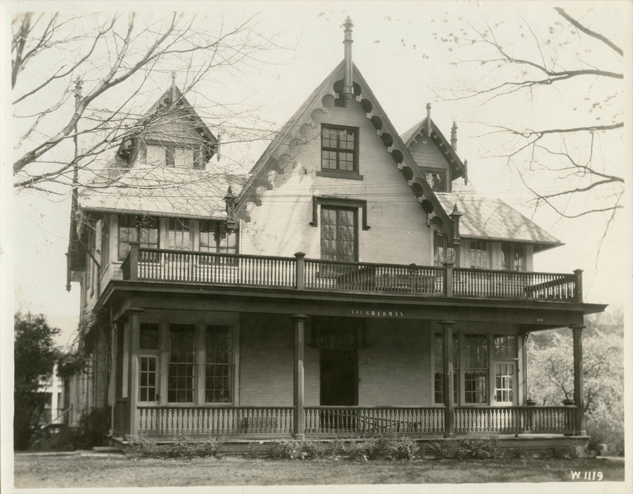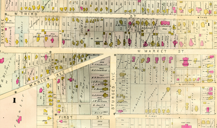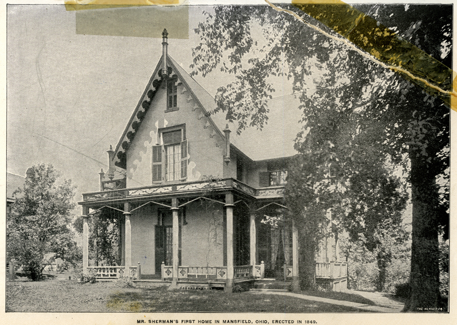 This detail from an 1853 wall map of Mansfield shows how our “5-way light” started out as a simple fork in the road where Marion Avenue diverged from Park Avenue (originally named Market Street.) The place where the Sturges Avenue hill would eventually be added to the map was, at that time, the property of E.P. Sturges; and the place where Bowman Street would be laid out was the home site of Roeliff Brinkerhoff.The 1882 Atlas of the City of Mansfield shows the downtown spreading out beyond the 5-way light, but there still was no Bowman Street. When it was carved into the plat in the 1890s a number of Park Avenue homes had to make way.An early landmark near the 5-way light was this distinctive 1849 house, significant as the first Mansfield home of Senator John Sherman. It stood on the north side of the street, a few doors east of where Bowman Street was placed. When Sherman’s fortunes rose in the Federal Government he traded up and moved to a mansion farther out Park Avenue West.In the years after Senator Sherman left this house it transformed into, what was noted in early annals as, the first ‘apartment house’ in town. Known as ‘The Sherman,’ it stood until 1955 when many of the Park Avenue West homes were removed for business properties.The southeast corner of Park Avenue West and Sturges Avenue was considered the most prime piece of real estate in downtown Mansfield for many generations. The city once negotiated with the last owner of this house to acquire the land for the main post office. Built in 1882 for the Weavers, the house was a bright center of the city’s social life when the Henry and Helen lived there; and then a dark spooky place when their reclusive son occupied the place. It was auctioned off in the late 1950s.When the Weaver house was removed the corner of Park Avenue and Sturges became a center of Mansfield’s social life again as the Downtown Motor Lodge was claimed the spot in 1961. It lasted until 2010 when the land was remade into a grassy knoll.The southwest corner of Park Avenue West and Sturges Avenue as it currently appears. This image contains roughly the same view as the photo below.Of these three impressive homes on Sturges Avenue only one remains today: the Bushnell House, seen on the far left of the photo; a longtime home of Mansfield’s auto license bureau.The Sturges hill that rises from Park Avenue had the most elite neighborhood in the city during the generations from the 1880s to the 1920s. As the high ground overlooking everything north of Park Avenue, it provided manufacturing magnates, bank officers, business executives, and their associated socialite families a place from which to look down on the rest of the town.Tree-lined brick streets and Model T Fords: that was downtown Mansfield in the 1920s. St. Luke’s stood on the point at the five-way intersection of Park Avenue, Marion, Bowman and Sturges, as it still does today; a still point around which flows traffic and the many drastic streetscape changes of ongoing decades.