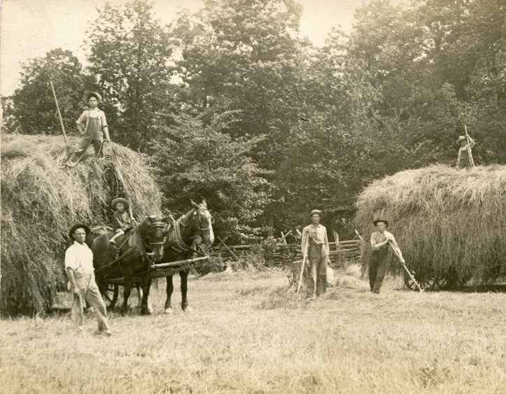 One common civic necessity during the age of Horse Power was the presence of horse rails along downtown streets; where horses, teams; rigs, wagons, and carriages could be secured while doing business. These features of 19th century streetscapes, as seen here in Bellville, were replaced by lined parking spaces in the 20th century.In the epochs of history before tractors and other steam or gas powered farm machinery were measured in “horsepower,” all of the essential horsepower was produced by horses. These haymakers were photographed in 1910. (Bellville-Jefferson Township Historical Society)