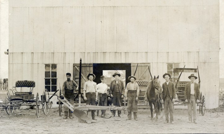 The livery stable in Ontario was actually located in New Castle: an ill-fated town platted just a mile east of Ontario on the “Mansfield-Bucyrus Stage Line.” There were no notes on the back of this photo to indicate why these men at New Castle were posing with their plow.