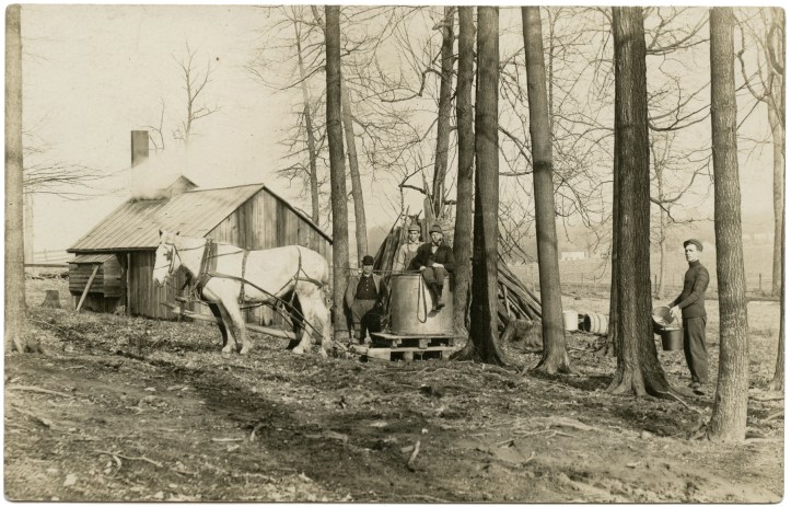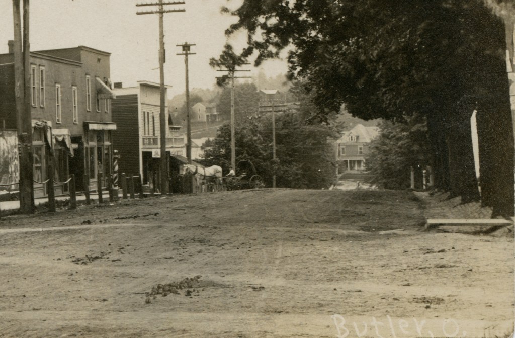 The hazards of crossing the street during the age of Horse Power were different than those we experience today: the streets were dirt, often mud; and the horses made the thoroughfares fragrant with road apples.These men in the hills south of Butler who gathered maple sap, were dependent upon horse power to get their unwieldy vats through the woods to the sugar camp in 1911.
