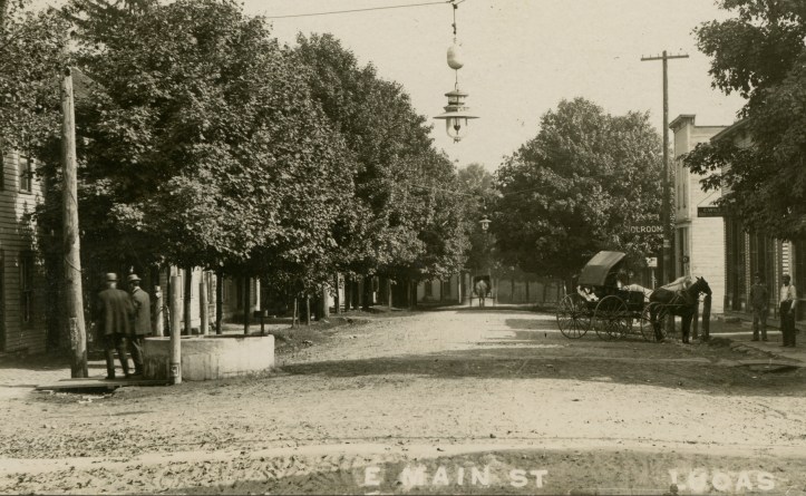 This view of downtown Lucas taken during the age of Horse Power reveals one key element of roadside necessity that travelers took for granted in those days, that has since vanished from our world: the horse trough. They didn’t have gas stations back then, but they did require a filling station: where horses could get a drink. Every town had some kind of public fountain or accessible water conduit to maintain their horse power.