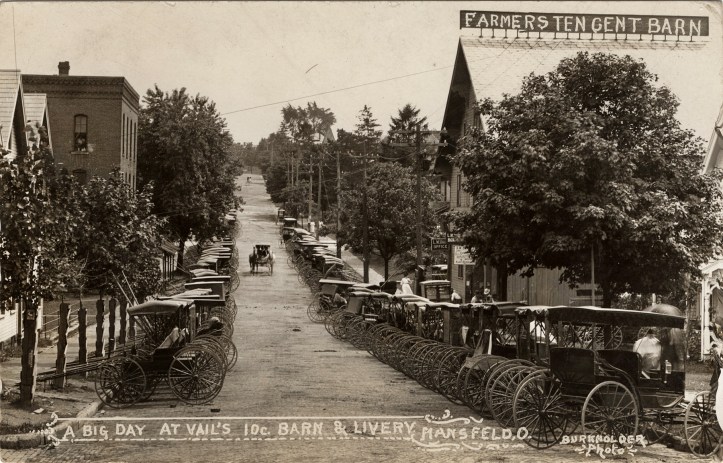 The largest livery in Mansfield was located on South Diamond near First Street, where it was easily available for folks who were headed to the Square. Hitching horses on the Square became illegal after 1900, when councilmen decided that a century of horse manure had not made the center of town any more attractive or fragrant. Every carriage in this photo came with a horse, and all the horses are stabled in the ten-cent barn.If you called for a cab in Mansfield during the age of Horse Power this is who might show up at your door. Miller’s Livery and Cab Line provided cabriolets for weddings, dances, and funerals. The stables were located on South Walnut Street between First and Second.