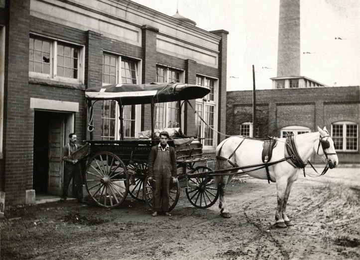 Every town had milk wagons in the early part of the 20th century that were pulled by horses; and it was common knowledge that the horses knew their delivery routes every bit as well as their human counterparts. The Shelby Pure Milk Co. had horse delivery service that was so successful, it lasted well into the age of automobiles: these two outfits were photographed in 1956. The men in the photo are Robert Went and Jay Moore; the names of the horses were not documented. (Shelby Museum of History)Today we know American Express as a credit card, but it began as a horse drawn express shipping service. This American Express horse was photographed at the Autocall Company in Shelby. (Shelby Museum of History)