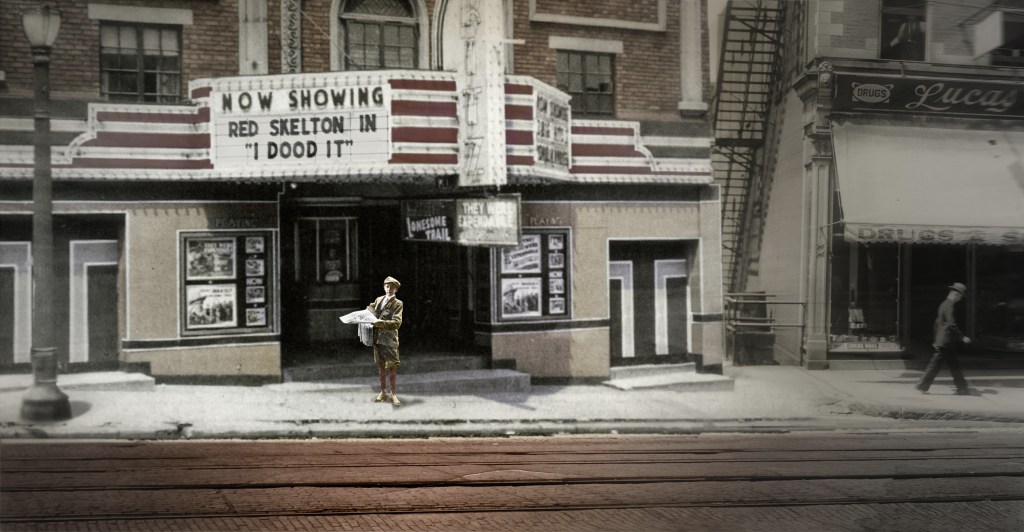 There is something irresistible about picturing young Red Skelton selling papers on Main Street. It gives him a role to play in the life of downtown; and actually, it is not difficult to see him playing three different roles in that script, as he did so often on stage: he could be the Mean Widdle Kid, bullying people into buying papers; and also a rubber-spined adult like Clem Kadiddlehopper, buying the paper; and then when the paper is discarded on the sidewalk, Freddie the Freeloader picks it up to use as a blanket when he falls asleep on a park bench in the Square.