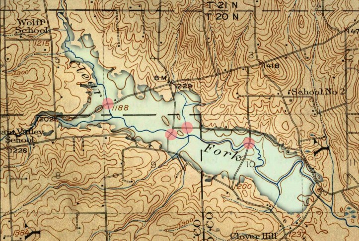 The Clear Fork Reservoir was built in the 1940s to flood the upper reaches of the westernmost branch of the Mohican River as a water supply for the City of Mansfield.  This topographical map of the area from 1915 has the lake superimposed over the valley to show where there were once bridges crossing the Clear Fork River before it was flooded.  I don’t know yet which of these bridges was the location of Shady Grove.