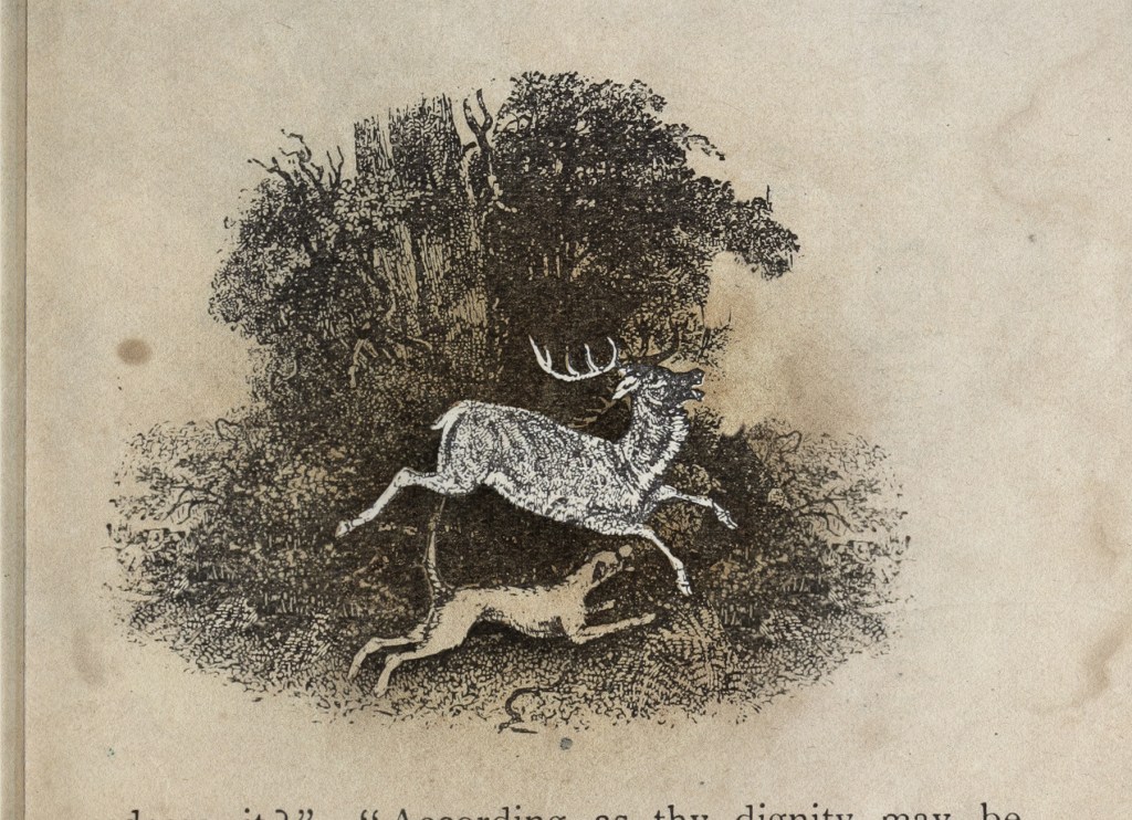 All he could do was chase them both down through the forest—the ghostly pale deer and the raving hound—and follow the echoes of that weird crying howl.  Homer cut toward the river, and he intercepted the racing animals when they all got to the bridge.