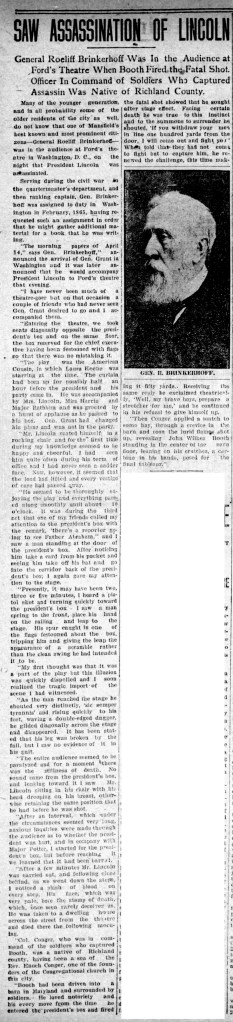 Read Brinkerhoff’s own words about his experience in Ford’s Theater from the Mansfield News February 6, 1909, as excerpted from his autobiography, Recollections of a Lifetime, 1900.