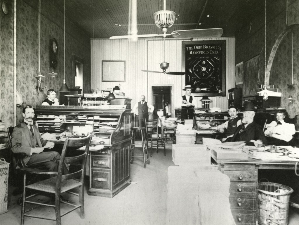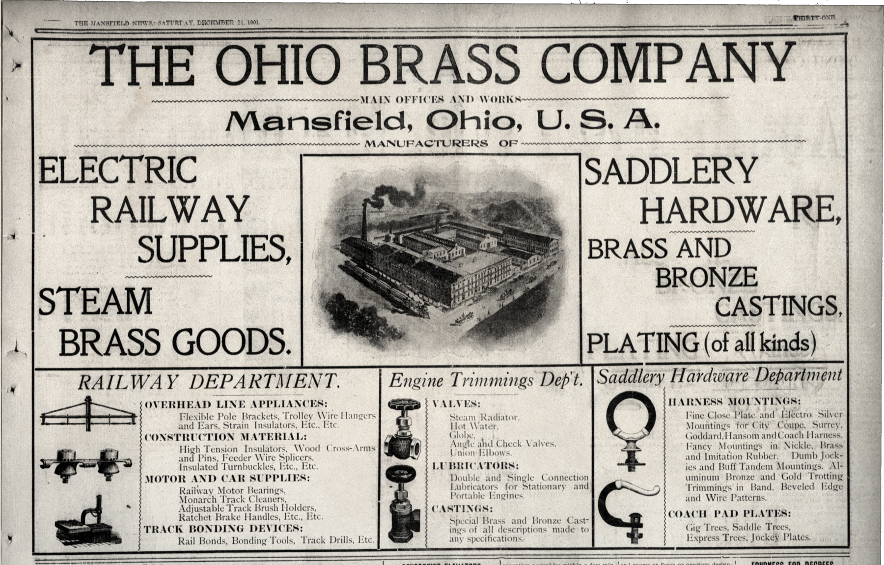 This was 1888 in the horse-drawn era when everyone needed all kinds of harness rigs to hook their horses to carriages, wagons and plows. Each of those leather contraptions required a kit full of small brass buckles, hooks, rings and cinches to hold the straps in place, and the Ohio Brass Company made that their business as Mansfield’s harness works.