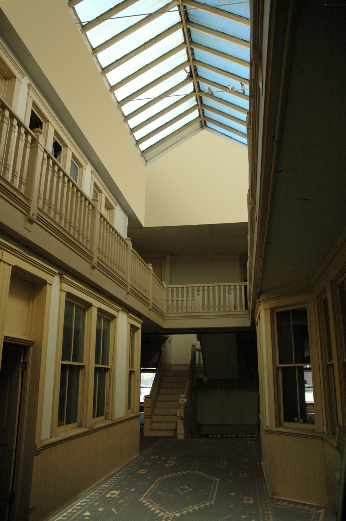 The three-story building had two floors of apartments above stairs, and the second landing sometimes housed business operations, because the third floor was designed as a balconied gallery so as to let the sunshine of a great skylight above brighten a cheery central foyer, which could serve as a waiting room.  A doctor saw patients there in the 1900s; a hairdresser in the 1910s.