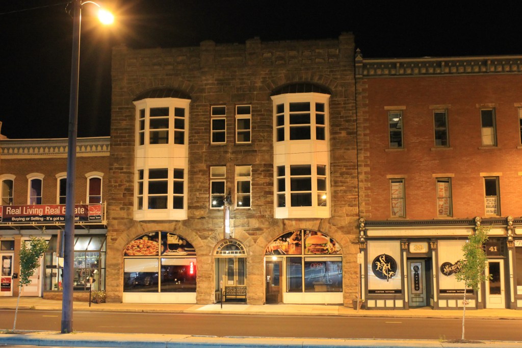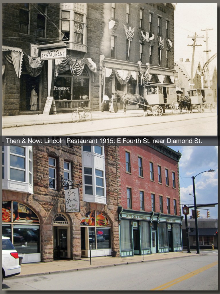 Built in 1890 of native stone, it entered the city’s history as the Carpenter Block.  It was the original address of the first Kroger’s in town; and when the Lincoln Highway came down Fourth Street in 1915, it turned into a restaurant stop for tourists.  In my younger days, it had been a well-known lunch tavern called the Daily Bar for decades, and in recent years it has become a micro-brewery called the Wooden Pony, and now City Grille.