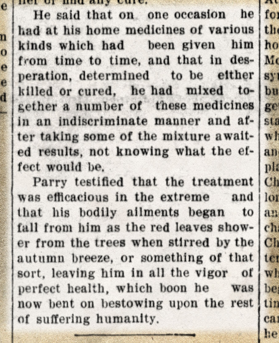 Numbers came out that weren’t merely dubious newspaper advertising testimonials, but rather sworn court testimony, to the effect that enough bottles of Parry’s Vegetable Compound sold that year to rake in what today would be nearly three million dollars. The next year, when the Federal Government refused to let Parry sell any of his bottles through the mail, after a high-profile court case served to advertise his claims all over the nation, his profits were closer to five million.