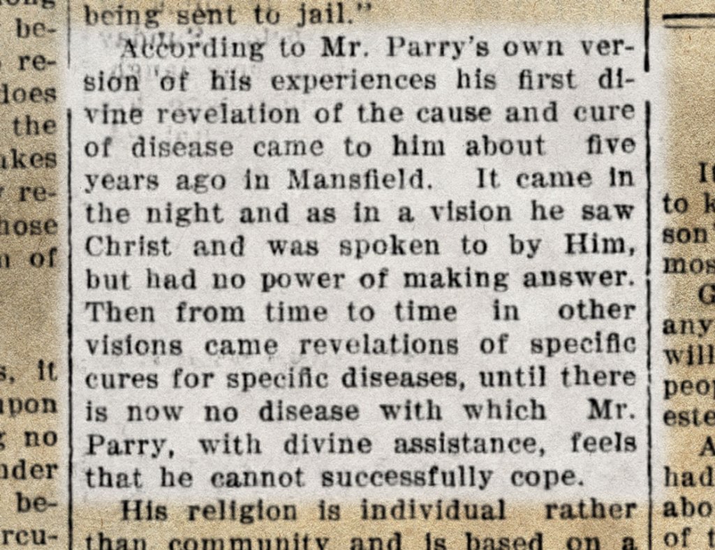 The book consists of 278 pages: being 10 pp. of Parry’s writing followed by 258 pps. of testimonials submitted by grateful customers all over the U.S. and Canada.
