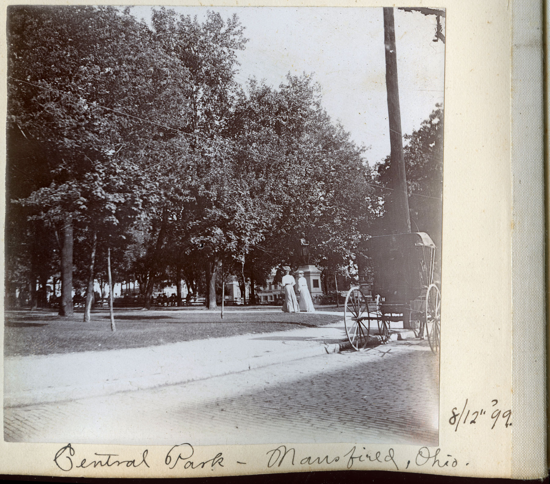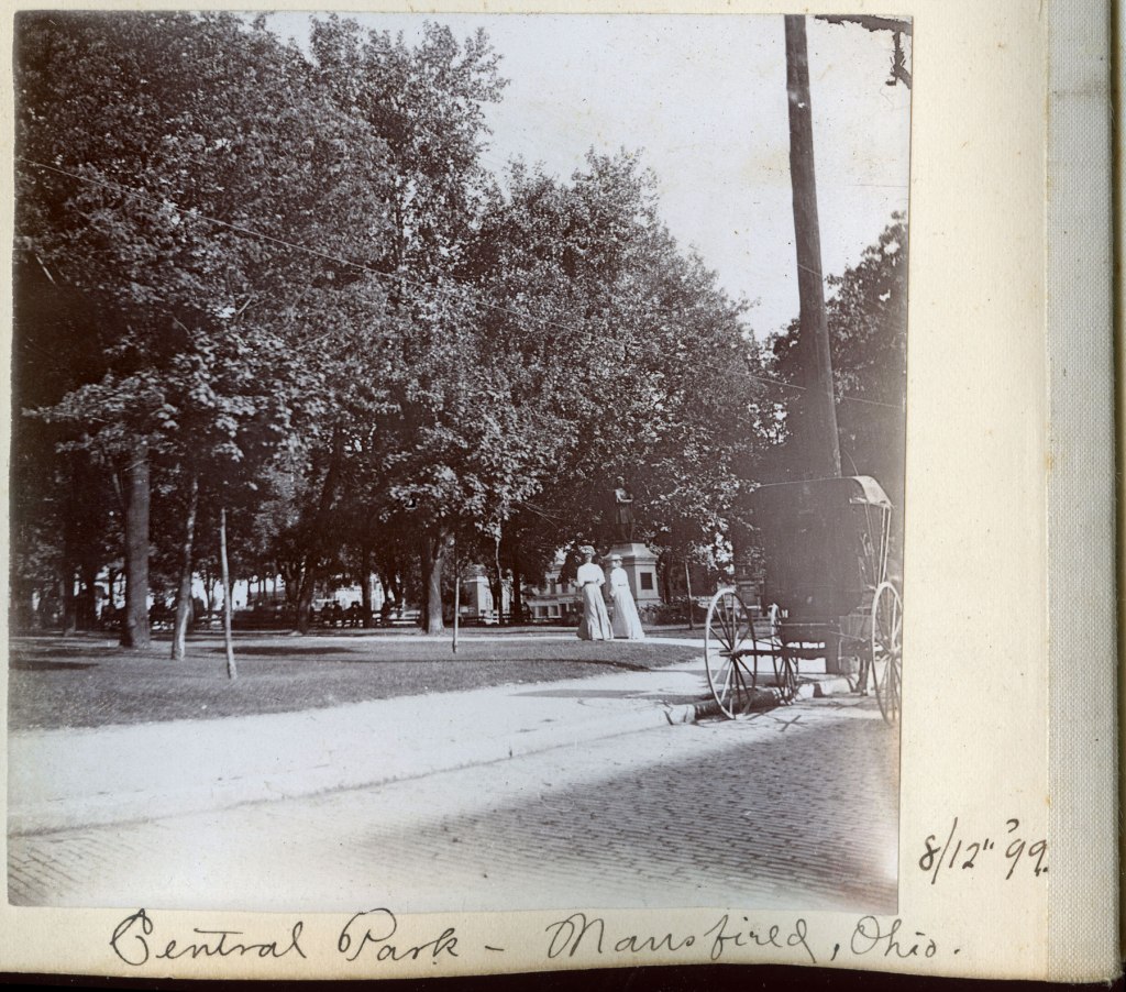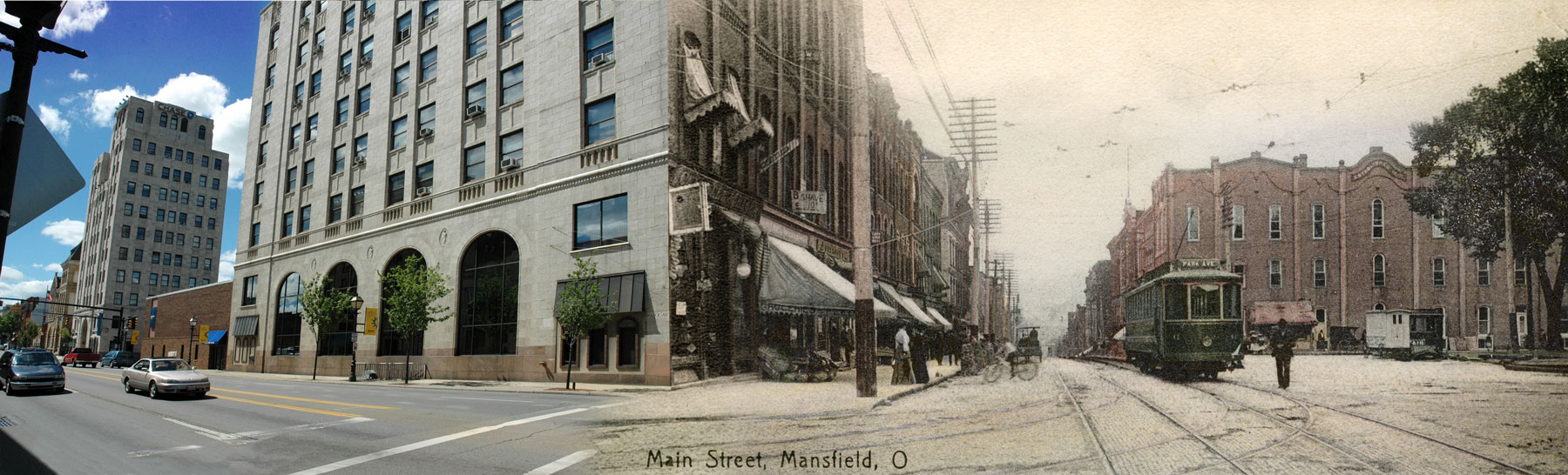 Overlaying two scenes of the same place two hundred years apart gives a sense of exactly where the first rough-hewn blockhouse was placed in the Square in 1812.This professional woodcut print published in the New York Illustrated News in 1862, depicts the oldest and most established block of Main Street at the Square during the Civil War years. The NW corner of Main & Park, seen in the left foreground, had a little frame General Store that was picked up and moved in 1864 to make way for the brick building seen below.The northwest corner of Main & Park got this landmark to anchor the Square from 1864 to 1926. The principal sidewalk storefront was the Caldwell & Bloor drug store, and it shared Main Street with a nickelodeon called the Arris. The second floor was a maze of lawyers’ offices, and the third floor was Mansfield’s armory.Streetcar tracks show this stretch of Main Street a modern urban center of 1911. Notice the portal of lights set in a wrought iron archway where Park Avenue meets Main, placed in 1908 to illuminate Mansfield’s centennial year.Mansfield was called the Mecca of Democrats in September of 1908 when a huge convocation of the species from all over the state convened for a day of political speeches and parades. The event was covered in detail by the city’s Republican newspaper, who focused particularly on how candidates “carefully dodged the issues,” and most particularly about the quality of cigars being distributed by various politicians. They didn’t mention what the umbrellas signified, as it did not rain that day.Looking east from Park Avenue West in 1899 shows what a park-like shady grove Central Park had grown into.Photo albums of the era frequently show friends and family against the background of the city’s scenic urban forest.This postcard gives an excellent idea of what the Main & Park area looked like before the whole skyline vigorously evolved in the 1920s. It was a wholly 19th century town well into the 20th century, with many church steeples and architecture evoking early American commerce.The first radical modifications of Mansfield’s downtown skyline took place on the south side of Park Avenue, spreading westward from Main with the Mechanics Bank building in 1926, the Walpark Building in 1926, and the Leland Hotel in 1927.The Farmer’s Bank tower, seen in the background, and the Richland Trust Bank rising in the foreground, completely recast the sense of downtown from modest urbanity to urban vitality in 1929.