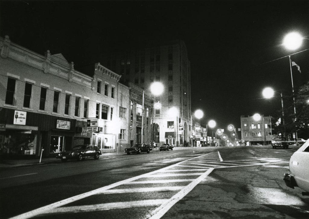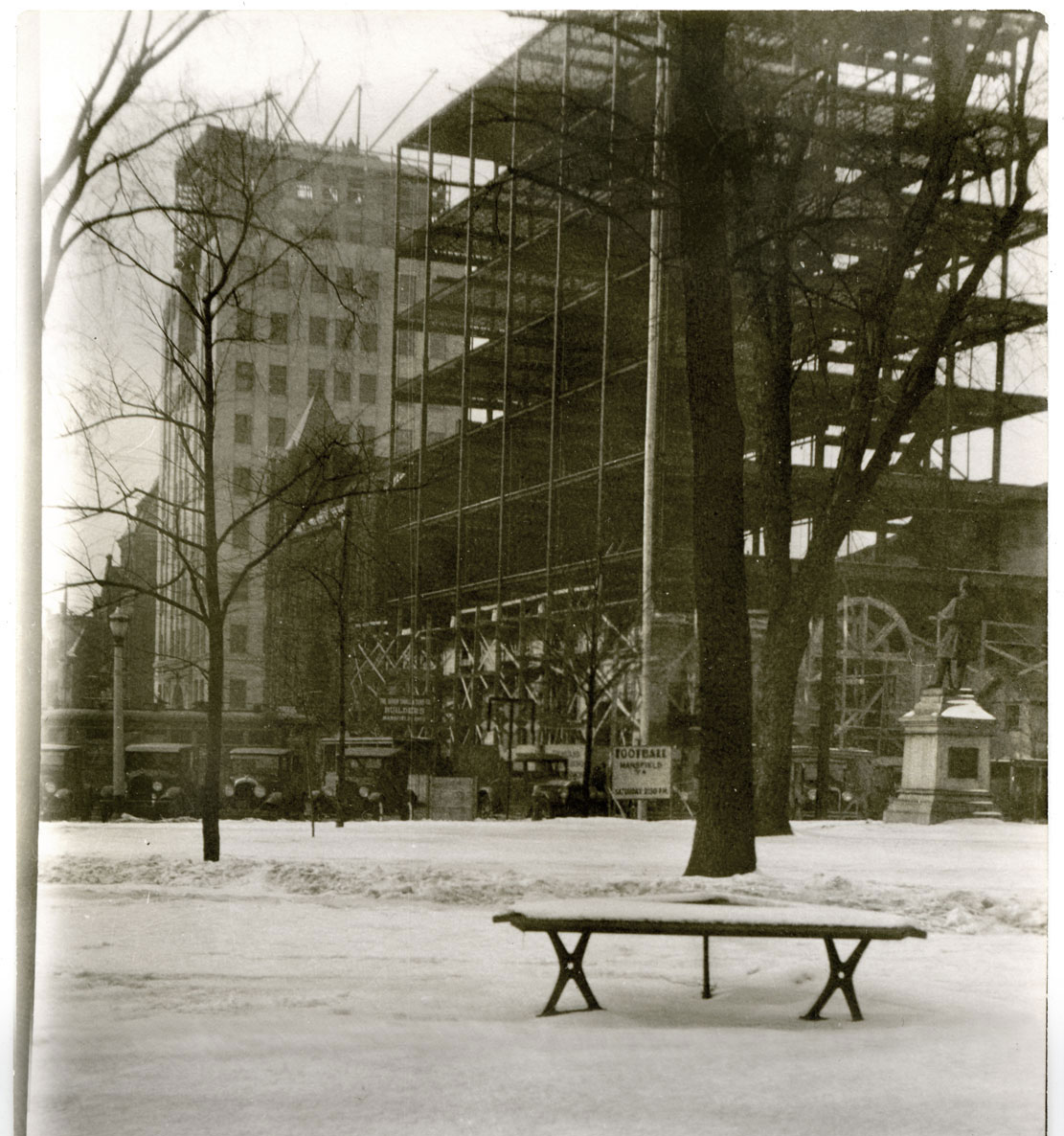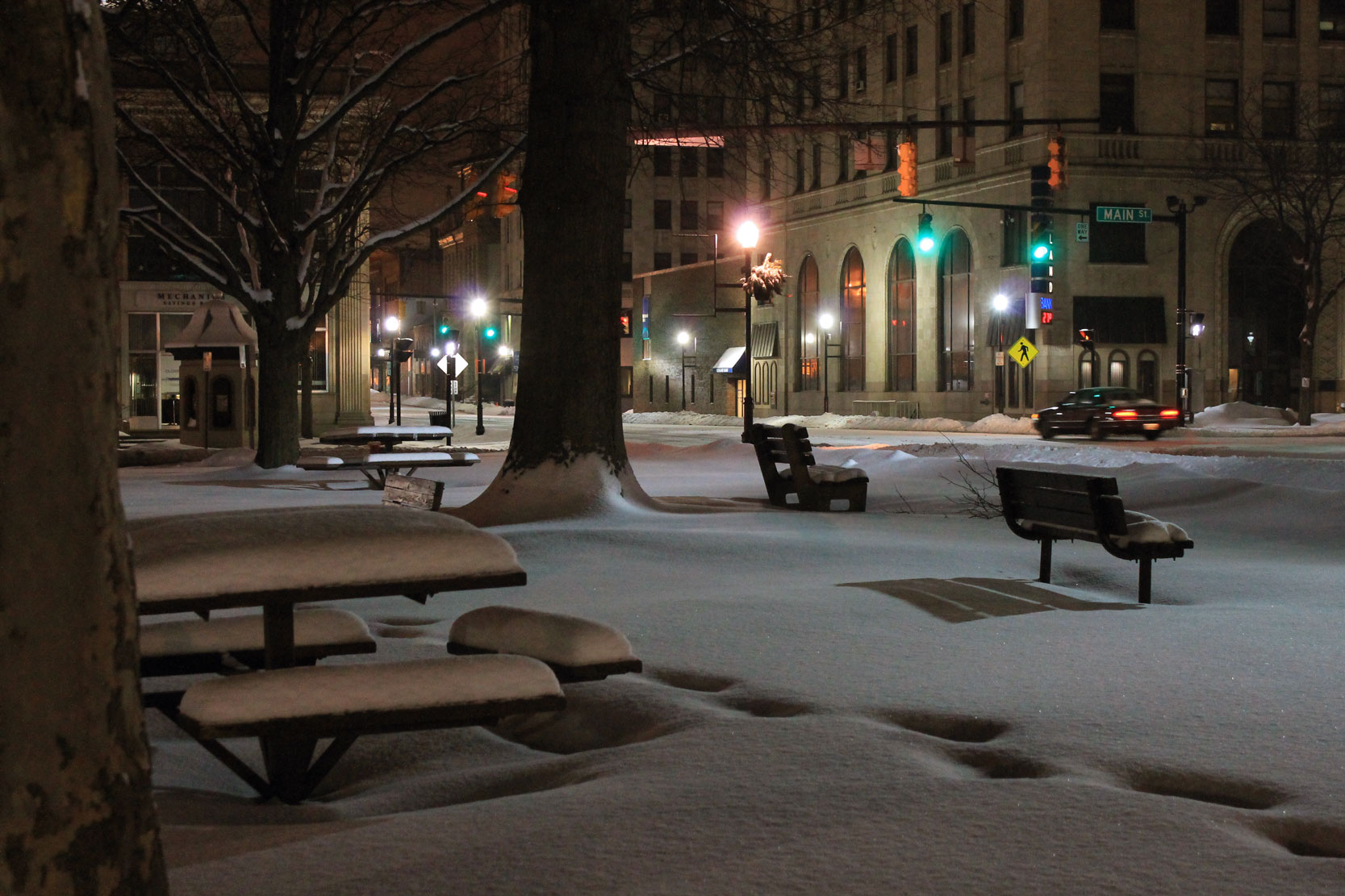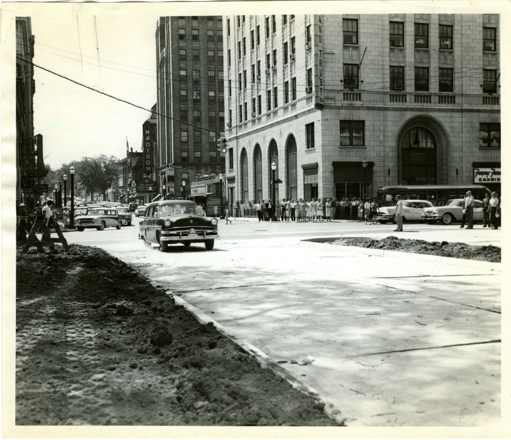 This campaign sign at Main & Park is from 1931.Just beyond the commercial blocks of downtown it is plain to see that Park Avenue was still a tree-lined residential street in this 1930s postcard.The southwest corner of Main & Park in 1957: the city hired Meter Maids for the first time because apparently they could afford them. There were more than 400 parking meters downtown raking in over $60,000 a year, and since the meters had been installed in 1940 the city had made $281,000 off them.In the early 1950s the Square was still operating as a traffic roundabout with traffic lights at car level on concrete islands.The Scouts of Troop 16 raise the 48-star U.S. flag for the last time before that flagpole is to be uprooted from the western side of the Square. In 1958 cars will soon be able to drive right through this hallowed ground.The Public Square became a public thoroughfare in 1958 when city officials directed the ceremonial first driver over the new pavement, following years of bitter conflict to preserve the sanctity of the Square.This news photo from 1977 shows the Main & Park block before the streetscaping was redesigned with wider sidewalks, fountains and planters.The easiest way to image Main & Park throughout the ages—both past and future—is with a soft layer of snow to erase the hard lines of now, and lay out a fresh white canvas on which to project new designs of the world to come.