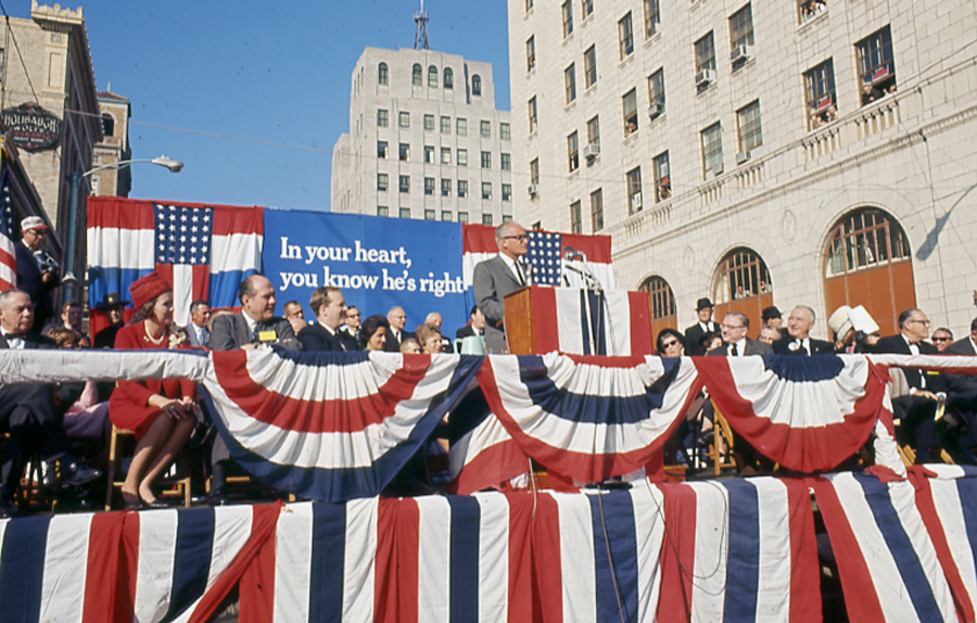 Presidential candidate Barry Goldwater campaigning in Mansfield October 17, 1964. Accounts said 15,000 folks gathered, more kids than adults, in a sea of Johnson/Humphrey signs, but even the hecklers were polite.