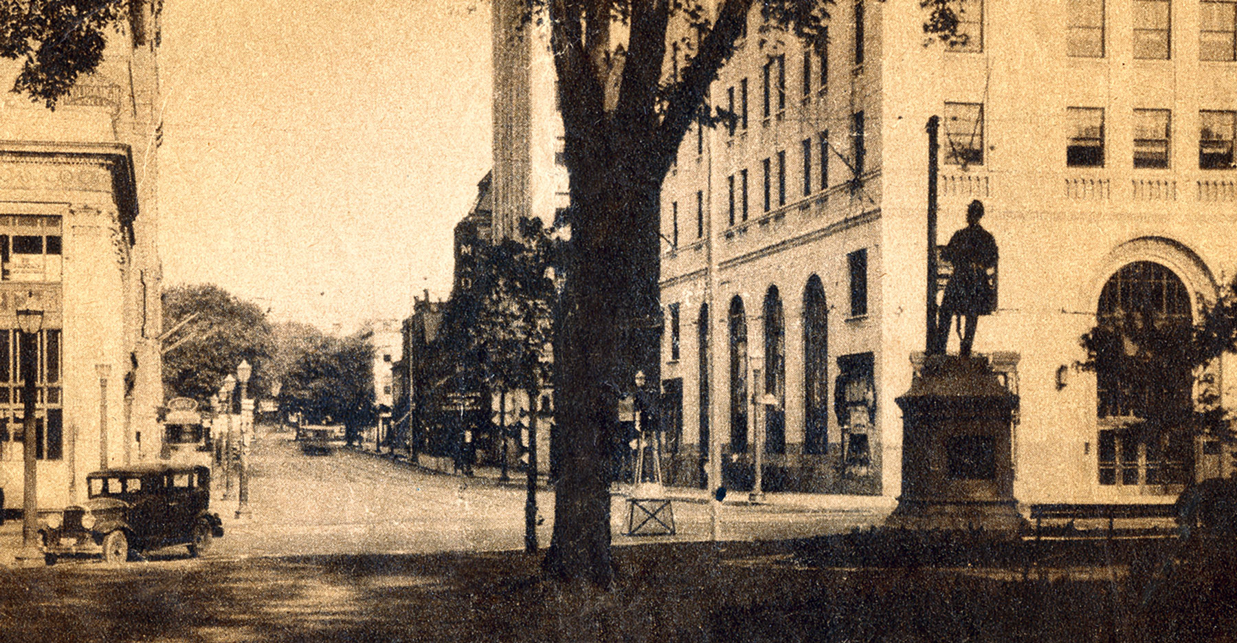 Main & Park in the 1930s captured in its full exuberance of night life.Keeping his eye on the western expanse of Park Avenue and guarding Central Park was Mansfield’s Civil War memorial placed in 1881. Most Civil War monuments of that era had their soldiers facing South to remember the sacrifice made by its community, but Mansfield’s was purposefully directed to the west in order to recognize “the great lands that were saved for the Union.”This portrait is among the all-time favorite pieces of Mansfield Memorial Day Americana: it has wisdom and naivety in the old man and his grandchild; sun and shadow; stars and stripes; orators of the Republic in the distant background, and ice cream socialists. Pathos and ethos of some long ago age that still informs our national soul. All on the Square in Mansfield in the 1890s.As the original clearing in the wilderness that gave rise to the community, the public Square has always been the heart of Mansfield, and throughout the two centuries of the town’s growth, that is where matters of the heart and head have been voiced as a community.
