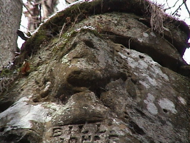 This is an easy assumption because there are at least two other face carvings in the nearby rock—no doubt inspired by the Singing Man— which definitely show the influence of Boy Scout culture. One of the imitators’ carvings wears a feathered Indian headdress like a Scouting ceremony. Both of them are brazenly signed like self-obsessed teenagers engaged in public park graffiti.