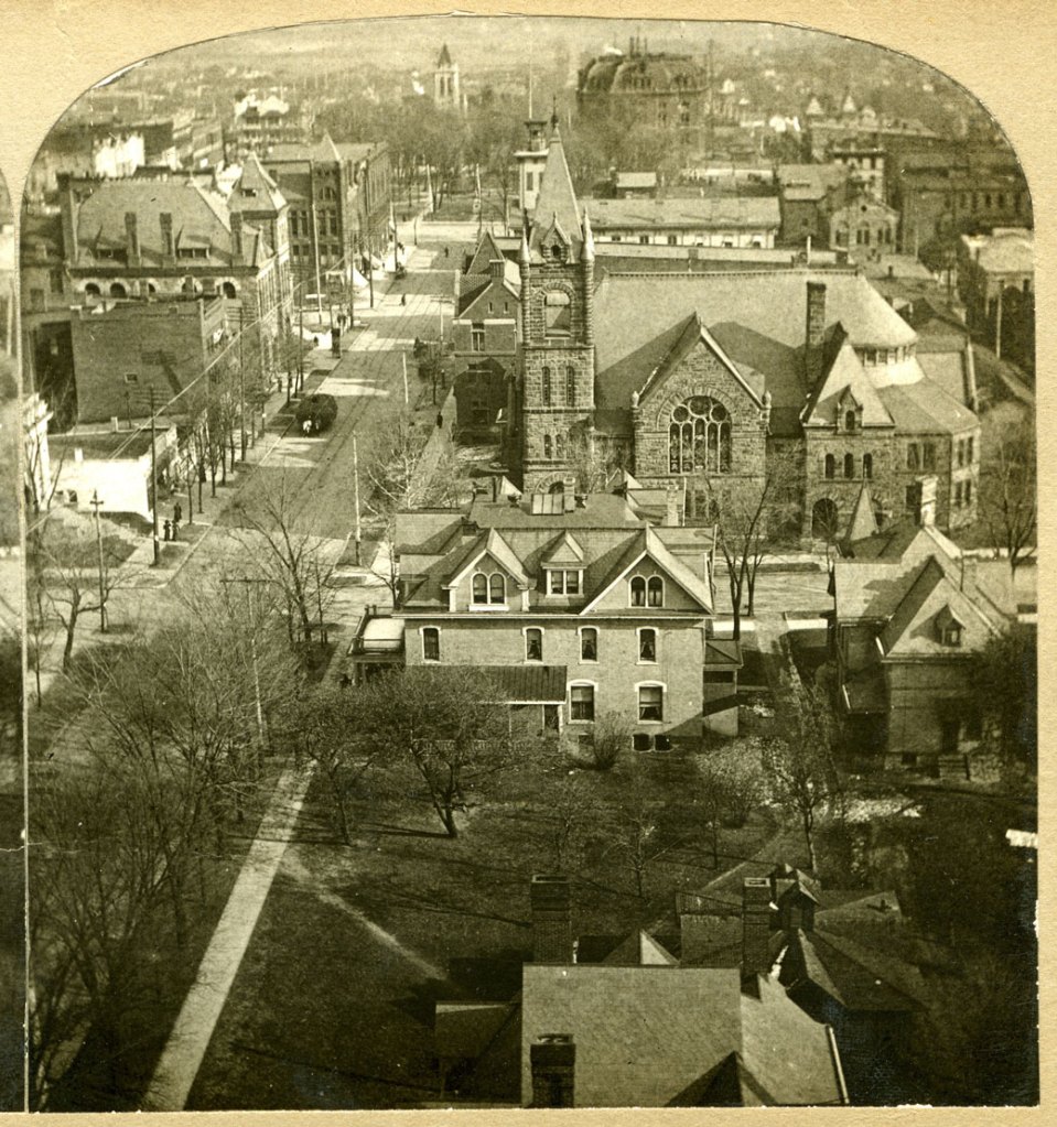 So it was not difficult for the boy in Mansfield to see himself in the mainstream of American history, and to see how that epic tale was embedded into his hometown. Lewis said he used to climb up in the massive steeple of the Congregational Church to peer down on the center of town, and he saw it like a map printed on the endpages of a grand novel of which he was a character and, simultaneously, the author.
