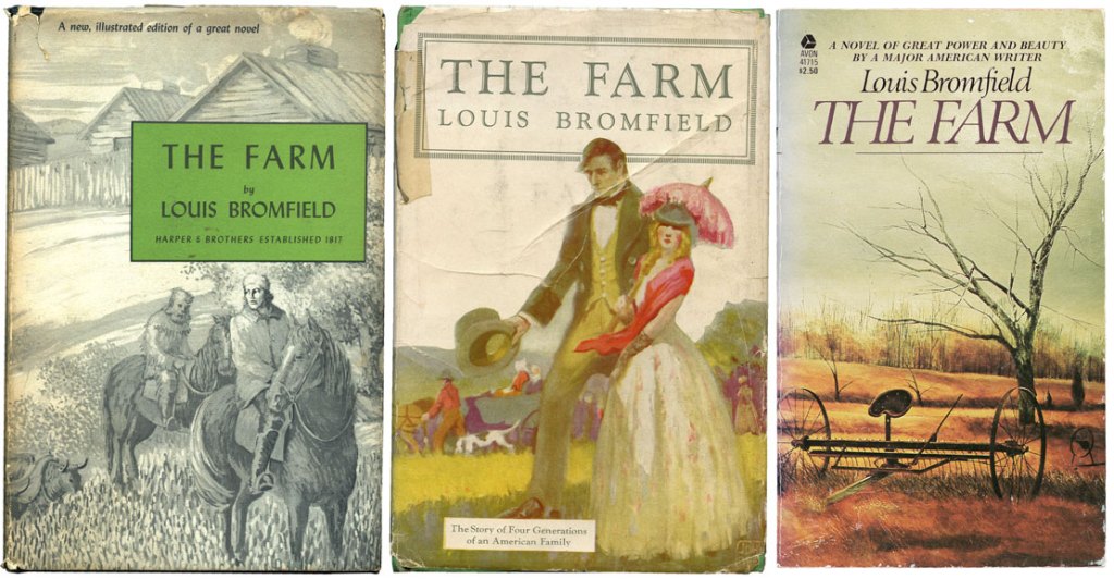 This house he built in the valley was a clear reminiscence of his Grandfather’s farm, as an evocation of the kind of life he intended to recreate from his youth in the early 1900s.This is a postcard Bromfield had printed to use for correspondence with his friends around the world to announce his excitement at reestablishing his Richland County roots. A careful examination of the image reveals two separate photos combined to create the illusion of Louis on an overlook that does not actually exist.The type of farm to which Bromfield wanted to return can be understood by reading his 1933 novel, The Farm. As is evident from these various cover illustrations for the book, his novel focuses on historical perspectives of farming in the 1800s.