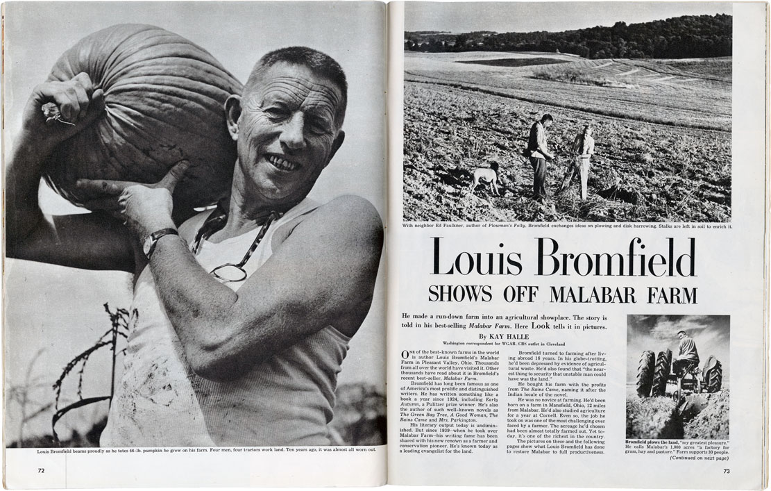 Among the ‘new’ methods of treating cropland that Bromfield practiced and promoted was Contour Planting to keep dirt from rinsing away in the rain, as seen here along Pleasant Valley Road.It was Bromfield’s unique celebrity status in the 1930s and ‘40s that enabled him to get information out to farmers at that critical moment of history. There were, of course, thousands of Agricultural Agents around the nation urging farmers to protect the soil, but high-profile articles like this 1949 Look Magazine made Bromfield’s endorsement reach millions of readers, to promote conservation far more than any Government project.Bromfield had media appeal and access unlike anyone else in Agriculture of his day to drive home his message. Life Magazine delivered Farmer Bromfield into hundreds of thousands of homes, this Saturday Evening Post featured his infomercial: “I Live On the Edge of Paradise,” and Reader’s Digest put Bromfield’s “We Will Not Have Enough to Eat” into the hands of folks in offices, railroad stations, commuter rails, and waiting rooms all across the country. This is a modest sampling of the media saturation he achieved.The cause of Soil Conservation propelled Bromfield’s words into print for everyone from children to tractor salesmen.A large part of Bromfield’s impact in 20th century agriculture came because his advice in print was clearly backed by personal, practical experience, and Malabar Farm was his proof.