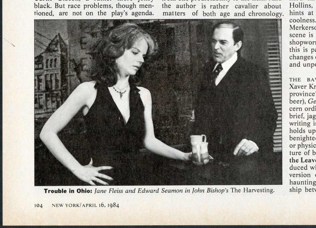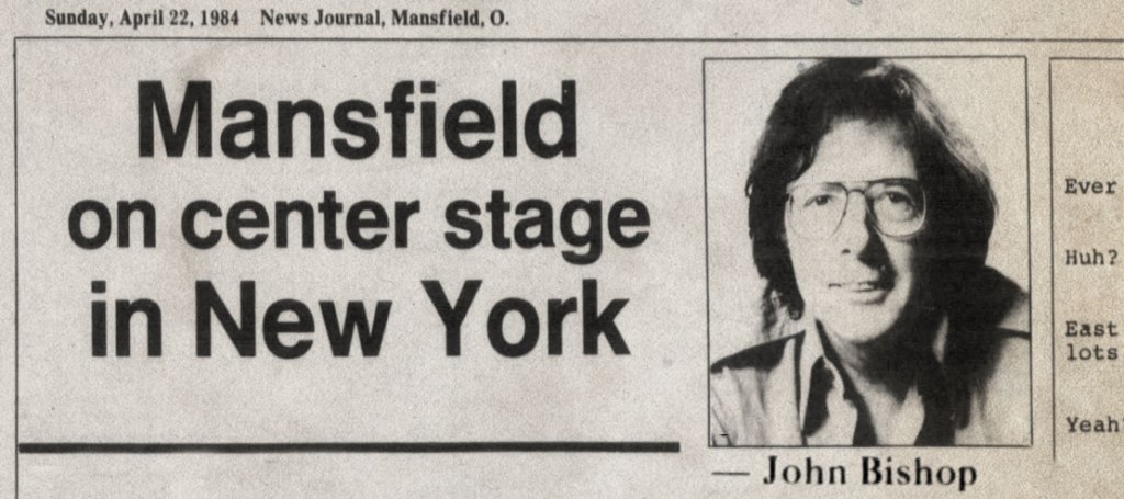 Here is a good example. His play, The Harvesting, is set in Mansfield, Ohio 1976. When it was performed in Manhattan at the Circle Repertory Company in 1984, the stage had a long surrounding background painted—quite literally—with scenes from downtown Mansfield. The characters had names he knew from his school days at Appleseed and Senior High. There are scenes that take place in a tavern called the Catalina—an old local landmark northeast of Madison. And when the Police band radio plays between scenes, the cops are all using actual local streets like Marion Avenue, Diamond Street, Lexington Avenue, and Route 42.