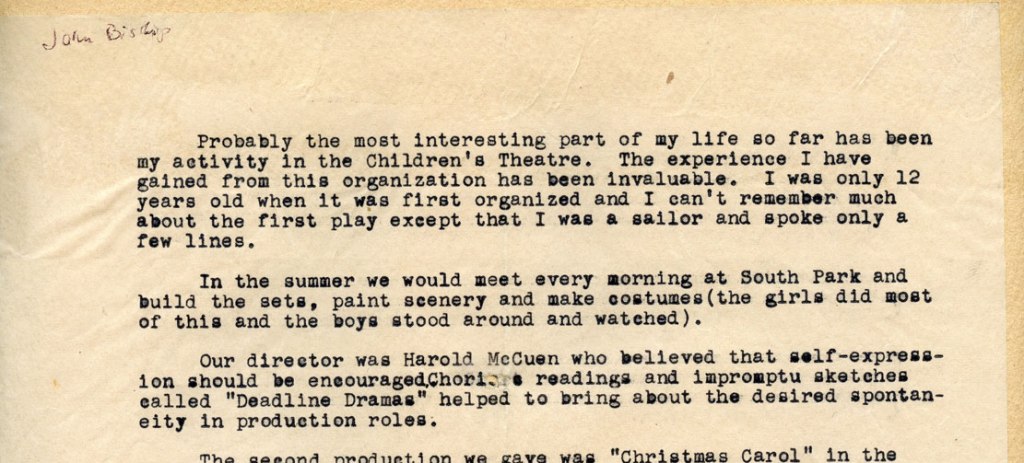 He was born in Mansfield. His father was a foreman at Westinghouse, his mother a volunteer in community theater. When Children’s Theater was born in Mansfield in 1937, John was the first to enroll.